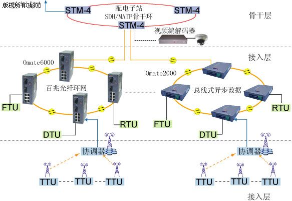 對于輸電線路沿線,終端通信接口是異步數據接口,采用Omate2000總線式數據光端機接入網絡;終端通信接口是以太網口,則采用Omate6000工業(yè)以太網交換機接入網絡。