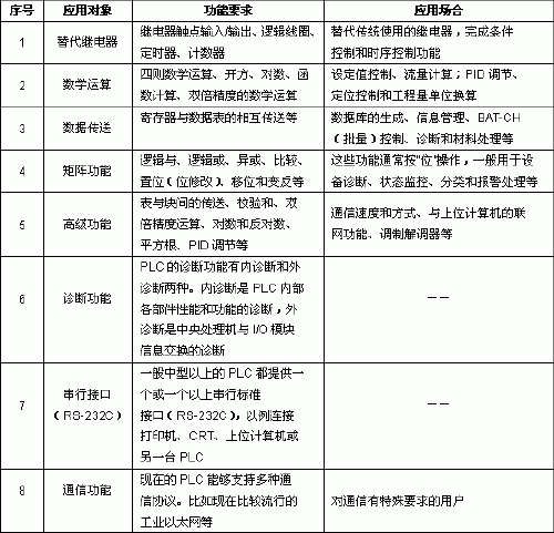 1 機型的選擇 PLC機型選擇的基本原則是,在功能滿足要求的前提下,選擇最可靠、維護使用最方便以及性能價格比的最優(yōu)化機型。 在工藝過程比較固定、環(huán)境條件較好(維修量較?。┑膱龊?,建議選用整體式結(jié)構(gòu)的PLC;其它情況則最好選用模塊式結(jié)構(gòu)的PLC。 對于開關(guān)量控制以及以開關(guān)量控制為主、帶少量模擬量控制的工程項目中,一般其控制速度無須考慮,因此,選用帶A/D轉(zhuǎn)換、D/A轉(zhuǎn)換、加減運算、數(shù)據(jù)傳送功能的低檔機就能滿足要求。 而在控制比較復(fù)雜,控制功能要求比較高的工程項目中(如要實現(xiàn)PID運算、閉環(huán)控制、通信聯(lián)網(wǎng)等),可視控制規(guī)模及復(fù)雜程度來選用中檔或高檔機。其中高檔機主要用于大規(guī)模過程控制、全PLC的分布式控制系統(tǒng)以及整個工廠的自動化等。根據(jù)不同的應(yīng)用對象,表1列出了PLC的幾種功能選擇。