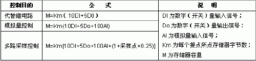 PLC系統(tǒng)所用的存儲器基本上由PROM、E-PROM及PAM三種類型組成,存儲容量則隨機器的大小變化,一般小型機的最大存儲能力低于6kB,中型機的最大存儲能力可達64kB,大型機的最大存儲能力可上兆字節(jié)。使用時可以根據(jù)程序及數(shù)據(jù)的存儲需要來選用合適的機型,必要時也可專門進行存儲器的擴充設(shè)計。 PLC的存儲器容量選擇和計算的第一種方法是:根據(jù)編程使用的節(jié)點數(shù)精確計算存儲器的實際使用容量。第二種為估算法,用戶可根據(jù)控制規(guī)模和應(yīng)用目的,按照表4的公式來估算。為了使用方便,一般應(yīng)留有25%~30%的裕量,獲取存儲容量的最佳方法是生成程序,即用了多少字。知道每條指令所用的字數(shù),用戶便可確定準確的存儲容量。表4同時給出了存儲器容量的估算方法。 表4 控制目的估算存儲器容量的方法