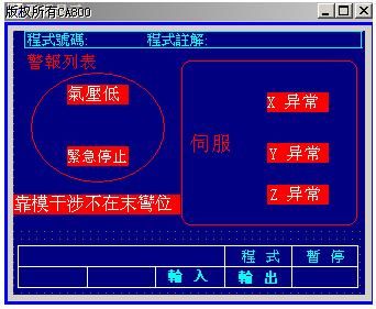 單節(jié)動(dòng)作的執(zhí)行MDI的模式下的運(yùn)行,可以做單個(gè)彎曲動(dòng)作。也可以對(duì)機(jī)臺(tái)動(dòng)作進(jìn)行前期調(diào)試;手動(dòng)各輔助動(dòng)作測(cè)試以及軸向點(diǎn)動(dòng)測(cè)試;完善的報(bào)警系統(tǒng),在操作不當(dāng)或機(jī)械故障時(shí)能在屏幕上作出提示,并停機(jī)報(bào)警,如圖7所示。
