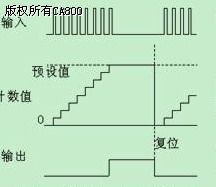 計(jì)數(shù)器的工作時(shí)序圖如圖二,當(dāng)產(chǎn)品數(shù)量計(jì)數(shù)到達(dá)預(yù)設(shè)值時(shí),計(jì)數(shù)器數(shù)字量輸出信號(hào)動(dòng)作,中止主機(jī)運(yùn)行。等用戶將計(jì)數(shù)器復(fù)位以后,主機(jī)又可以再次運(yùn)行。