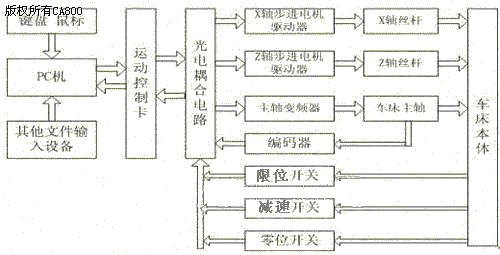 2、運(yùn)動(dòng)控制卡。我們采用了由ADVANTECH公司生產(chǎn)的PCL運(yùn)動(dòng)控制卡。該卡是一種高速三軸步進(jìn)電機(jī)運(yùn)動(dòng)控制卡,它有16位的數(shù)字輸入、輸出口,可實(shí)現(xiàn)三軸聯(lián)動(dòng)。因此,它可以滿足車床X,Z軸聯(lián)動(dòng),實(shí)現(xiàn)直線,圓弧插補(bǔ)。