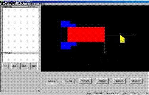 該車床控制系統(tǒng)的軟件部分采用VC++6.0編寫,該軟件的加工界面如圖2。其功能主要有讀取零件的加工G代碼,編輯和編譯G代碼,仿真加工(包括加工前仿真和與加工同步仿真,回參考點(diǎn),手工對(duì)刀,加工中斷,超程軟限位等功能。它可處理進(jìn)給速度,主軸速度及轉(zhuǎn)速方向,刀具信息,M功能等多種加工信息。該軟件的操作平臺(tái)是Windows98。該軟件的操作過程是首先讀入*.NC或*.TXT的G代碼文件;然后進(jìn)行編譯,編譯器能給出不符合本軟件的語(yǔ)法錯(cuò)誤提示;有錯(cuò)誤可也立即修改;然后按照毛胚的實(shí)際尺寸輸入,軟件進(jìn)行加工前仿真。在確認(rèn)沒有因G代碼引起的加工錯(cuò)誤的情況下,可以開始機(jī)床加工。加工前得首先對(duì)刀,對(duì)刀的意義在于建立起工件坐標(biāo)與車床坐標(biāo)之間得關(guān)系。加工過程中,軟件界面的狀態(tài)欄還顯示出刀具當(dāng)前的坐標(biāo),加工狀態(tài),加工時(shí)間等信息。