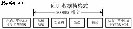 在RTU模式中,幀總是以3.5個字節(jié)的傳輸時間靜默,作為開始。RTU的數(shù)據(jù)格式為: