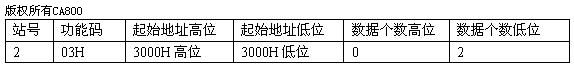 幀格式為:站號 功能碼(03H) 起始地址高位 起始地址低位 數(shù)據(jù)個數(shù)高位 數(shù)據(jù)個數(shù)低位 CRC低位 CRC高位
