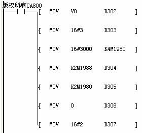 通訊組幀功能部分,通過字?jǐn)?shù)據(jù)傳輸指令(MOV)可以將數(shù)據(jù)組成通訊幀,從D302開始到D307結(jié)束。艾默生的MODBUS協(xié)議自動在通訊幀的后面加了CRC校驗(yàn),不需要使用者計(jì)算CRC校驗(yàn)。