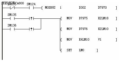 利用標(biāo)志位進(jìn)行通訊互鎖,MODBUS指令發(fā)送數(shù)據(jù)串,接收數(shù)據(jù)放入D7970中。