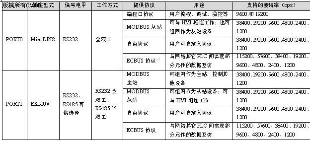 EC10系列PLC主模塊提供了兩個串行異步通訊端口,分別為PORT0和PORT1。通訊口特性如表所示。