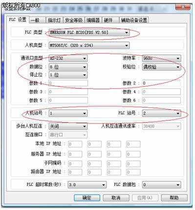A)、觸摸屏和PLC的連接通過RS232端口進(jìn)行,PLC的類型選擇EMERSON PLC EC20[PDS V2.50>.