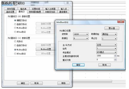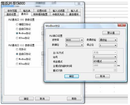 B)、觸摸屏作為主站PLC作為從站,采用MODBUS主從式協(xié)議進(jìn)行通訊,PLC從站地址選擇為2,觸摸屏主站地址設(shè)置為1.