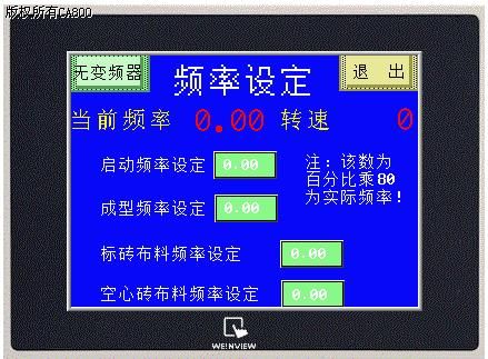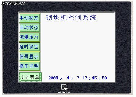 可以在觸摸屏上對砌塊成型機(jī)的手動、自動狀態(tài)、流量壓力、延時進(jìn)行設(shè)置,也可以顯示當(dāng)前的信號狀態(tài)。