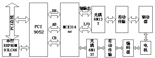根據(jù)項(xiàng)目要求,采用MCX314as為運(yùn)動(dòng)控制核心,上位機(jī)只需將運(yùn)動(dòng)參數(shù)寫(xiě)入MCX314as的寄存器,各種復(fù)雜的運(yùn)動(dòng)控制,插補(bǔ)計(jì)算均由MCX314as完成,極大地提高了運(yùn)算和控制速度,通過(guò)PCI9052為PCI橋接口與計(jì)算機(jī)通信,完成了4軸伺服/ 步進(jìn)電機(jī)控制,實(shí)現(xiàn)位置,速度,加速度控制和直線、圓弧插補(bǔ)的功能。