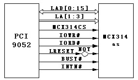PCI9052 是PLX公司為擴(kuò)展適配板卡推出的一款高性能、低價(jià)位的PCI總線從模式接口芯片。芯片引腳可直接與適配板卡金手指相連,它的各個(gè)引腳的名稱和功能可參考它的DATASHEET[1>。局部總線與MCX314as的數(shù)據(jù)線、地址線、控制線等相連。