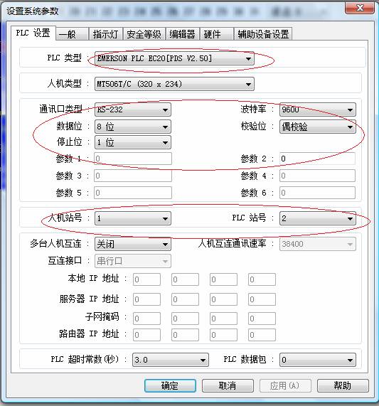 A)、觸摸屏和PLC的連接通過(guò)RS232端口進(jìn)行,PLC的類型選擇EMERSON PLC EC20[PDS V2.50].