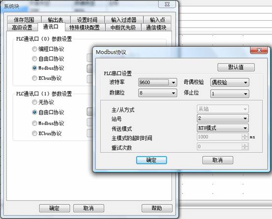 B)、觸摸屏作為主站PLC作為從站,采用MODBUS主從式協(xié)議進(jìn)行通訊,PLC從站地址選擇為2,觸摸屏主站地址設(shè)置為1.