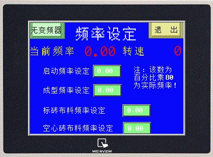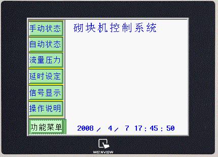 可以在觸摸屏上對(duì)砌塊成型機(jī)的手動(dòng)、自動(dòng)狀態(tài)、流量壓力、延時(shí)進(jìn)行設(shè)置,也可以顯示當(dāng)前的信號(hào)狀態(tài)。