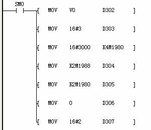 通訊組幀功能部分,通過(guò)字?jǐn)?shù)據(jù)傳輸指令(MOV)可以將數(shù)據(jù)組成通訊幀,從D302開始到D307結(jié)束。艾默生的MODBUS協(xié)議自動(dòng)在通訊幀的后面加了CRC校驗(yàn),不需要使用者計(jì)算CRC校驗(yàn)。