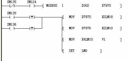 利用標(biāo)志位進(jìn)行通訊互鎖,MODBUS指令發(fā)送數(shù)據(jù)串,接收數(shù)據(jù)放入D7970中。
