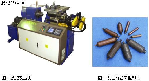 本例介紹的是鋼管旋壓機(jī),主要是用于將管頭的直徑縮小,生產(chǎn)出的零件用于一些制冷行業(yè)。電氣控制系統(tǒng)采用中達(dá)電通PUTNC-H4-2數(shù)控系統(tǒng)+兩套臺(tái)達(dá)伺服系統(tǒng),數(shù)控旋壓機(jī)圖片參見(jiàn)圖1,鋼管旋壓機(jī)的成型制品參見(jiàn)圖2。