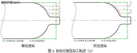 ?。?)軌跡設(shè)計(jì)。第一種自動(dòng)化旋壓加工軌跡如圖3所示。第二種自動(dòng)化旋壓加工軌跡如圖4所示。采用第一種進(jìn)給方式優(yōu)點(diǎn)是編程簡(jiǎn)單,工件表面光潔度好,但是容易導(dǎo)致工件變粗或拉斷,因此采用第二種進(jìn)給方式。
