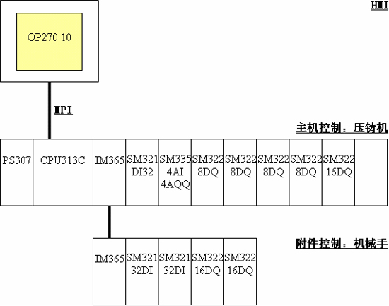 系統(tǒng)由HMI和S7-300型PLC構(gòu)成。因?yàn)橛形恢?、壓力、速度等曲線需要顯示,所以選擇了OP270 10。顯示效果比較好,有操作按鍵,容易維護(hù);由于需要3路PWM輸出控制步進(jìn)電機(jī),所以選擇了CPU313C,幾乎全部利用該CPU的數(shù)字量輸入輸出及模擬量輸入輸出,性價(jià)比非常好;另外,由于壓射過(guò)程非常快,通常為10-50m/s,有時(shí)甚至可以達(dá)到100m/s以上。系統(tǒng)需要高速采集大量的數(shù)據(jù)進(jìn)行顯示、分析和比較,因此選擇了SM335模塊,它的模擬量輸入輸出速度快、精度高,還可以產(chǎn)生硬件中斷。
