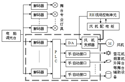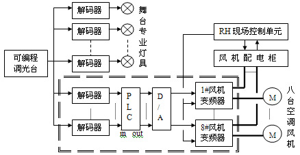 該方案利用調(diào)光系統(tǒng)的解碼器把電腦調(diào)光臺的編程控制空調(diào)風(fēng)機(jī)的指令解碼送到PLC上,PLC經(jīng)編程輸出數(shù)字信號再經(jīng)D/A轉(zhuǎn)換器轉(zhuǎn)換為4~20MA的電流信號,該電流信號作為各個風(fēng)機(jī)變頻器的外部觸發(fā)信號變頻調(diào)速運(yùn)行風(fēng)機(jī),產(chǎn)生節(jié)目需要的空氣氣流為舞臺藝術(shù)效果創(chuàng)造條件。原有的RH自控系統(tǒng)增加對變頻器啟動運(yùn)行的控制,這樣保證了變頻器控制的風(fēng)機(jī)在非節(jié)目需要時候的正常的全速運(yùn)行。