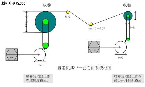 ?。?)放卷:采用恒線速度運行方式,當(dāng)前線速度由PLC通過通訊方式給定;放卷電機(jī)安裝有編碼器,卷徑通過厚度積分法來實現(xiàn),需要設(shè)置材料的厚度;由于此系統(tǒng)配置HMI,材料厚度由客戶自行設(shè)定。電機(jī)運轉(zhuǎn)速度由當(dāng)前線速度和當(dāng)前卷徑來計算。