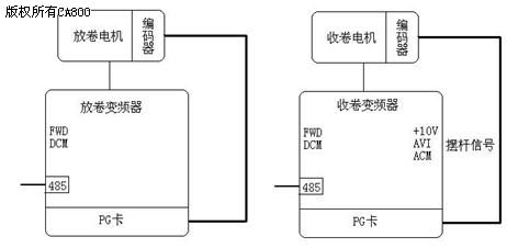 由于放卷電機(jī)安裝有編碼器,所以讓變頻器工作在閉環(huán)模式下。PLC實現(xiàn)卷徑計算模塊并設(shè)置材料的實際厚度線速度來源以及機(jī)械齒輪比。線速度通過通訊由PLC給定。