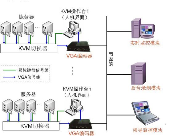 在機(jī)房?jī)?nèi)通常多臺(tái)服務(wù)器共用一套鼠標(biāo)、鍵盤(pán)和顯示器,通過(guò)KVM切換器進(jìn)行切換選擇對(duì)哪一臺(tái)設(shè)備進(jìn)行操作。KVM 的意思是“鍵盤(pán)、顯示器及鼠標(biāo)”, 這三項(xiàng)加起來(lái)稱(chēng)為一組 KVM 操作臺(tái),KVM操作臺(tái)即是機(jī)房?jī)?nèi)的“人機(jī)界面”,在KVM操作臺(tái)上任何操作均在顯示器上顯示出來(lái)。在機(jī)房人機(jī)界面監(jiān)控方案中需要在機(jī)房?jī)?nèi)每一個(gè)KVM切換器旁安裝VGA編碼器一臺(tái),該編碼器即可將該人機(jī)界面處的任何操作采集并編碼通過(guò)網(wǎng)絡(luò)傳送給后臺(tái)相應(yīng)的功能模塊,實(shí)現(xiàn)遠(yuǎn)程實(shí)時(shí)監(jiān)控和同步錄制等功能。