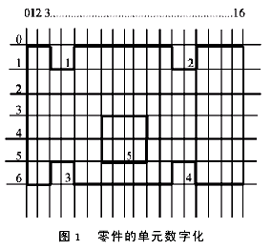 鈑件的形狀可分割成一些簡(jiǎn)單的圖形元素,然后合成所需圖形。例如:矩形是4個(gè)直角的合成;波浪形是一些曲線的合成等。因此,對(duì)于一些精度要求較高的小批量甚至單件生產(chǎn)的鈑金件,可以用一些通用件迅速組裝成單元沖壓模具,采用數(shù)控技術(shù),使之快速成形。將被加工鈑金件看成一個(gè)可被分割的平面圖形,對(duì)分割出來(lái)的簡(jiǎn)單圖形元素進(jìn)行數(shù)字化處理。即按其方位進(jìn)行定位編碼。如圖1所示的非等距簡(jiǎn)單圖形零件的數(shù)字化,缺口1、2、3、4的(Δx,Δy)均相等,方孔5的(Δx,Δy)均等于2倍的(Δx,Δy),設(shè)現(xiàn)有通用沖頭的寬等于Δx,長(zhǎng)等于Δy,則按如圖1所示進(jìn)行編號(hào)。缺口1由位置(2,0)以及位置(3,0)合成,缺口2、3、4同樣由兩個(gè)位置合成,方孔由8個(gè)位置合成。如果采用矩形單元快速成形,可以獲得如圖2所示的二維編碼,由于劃分過(guò)細(xì)使得到的編碼較長(zhǎng)。如果采用正方形單元快速成形,則可以獲得如圖3所示的二維編碼,其編碼減小一半。