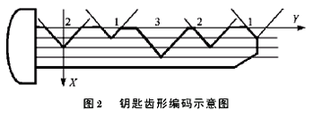當(dāng)選定齒距和級(jí)差值后,鑰匙的齒形加工位置可以轉(zhuǎn)換為級(jí)差數(shù)最后齒形編碼為一維數(shù)組((2 1 3 2 1)。由以上可知數(shù)字化編碼是單元沖模快速成形的關(guān)鍵,合適的編碼不僅可以提高生產(chǎn)效率,而且可以節(jié)省存儲(chǔ)內(nèi)存。