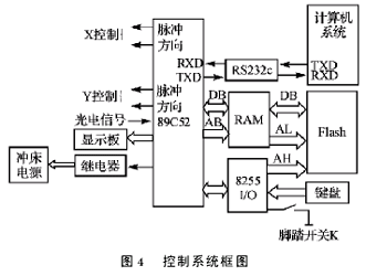 數(shù)控系統(tǒng)的人機(jī)界面采用鍵盤輸入LED顯示鍵盤具有數(shù)字鍵、設(shè)定、修改、查尋、X及Y方向的調(diào)整、執(zhí)行等的功能鍵,可用來(lái)完成加工程序的輸入、修改及對(duì)控制的操作和調(diào)整等。操作人員根據(jù)被加工件的形狀在計(jì)算機(jī)上進(jìn)行編碼,自動(dòng)生成加工程序,通過(guò)串行口將加工程序下載給單片機(jī)并且保存在FLASH ROM中。工模安裝后手動(dòng)調(diào)整零位。進(jìn)入執(zhí)行后單片機(jī)從FLASH ROM中取得加工程序,并計(jì)算X,Y方向的步進(jìn)距離后再將其轉(zhuǎn)換成相應(yīng)的步進(jìn)脈沖數(shù)控制X,Y方向的步進(jìn)電機(jī)的轉(zhuǎn)動(dòng)步數(shù)。當(dāng)光電信號(hào)檢測(cè)到上模位于開(kāi)啟位置時(shí)數(shù)控系統(tǒng)迅速將待加工件定位到加工位置,并且啟動(dòng)沖床上沖模下壓,實(shí)現(xiàn)一次沖壓。在沖床帶動(dòng)上沖模開(kāi)啟時(shí)數(shù)控系統(tǒng)迅速地將待加工件移動(dòng)到下一加工位置等待下次沖壓,直到完成加工停止沖床運(yùn)動(dòng)。