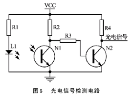 數(shù)控單元沖模是安裝在曲軸式壓力機(jī)上的,機(jī)床的沖壓原理不變。需要控制的是兩方面內(nèi)容:首先要確定零點(diǎn)以及各工位點(diǎn)的位置;其次在上沖模往復(fù)動(dòng)作的啟停間被加工件的按編碼所得的X,Y方向的快速進(jìn)給送料運(yùn)動(dòng)以及這兩個(gè)動(dòng)作的協(xié)調(diào)。即實(shí)現(xiàn)沖壓和送料動(dòng)作的同步控制??刂葡到y(tǒng)框圖,如圖4所示。光電信號(hào)檢測(cè)電路圖,如圖5所示。