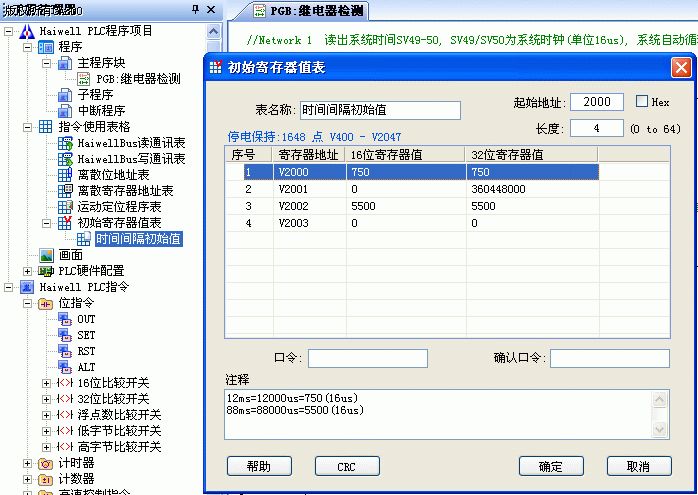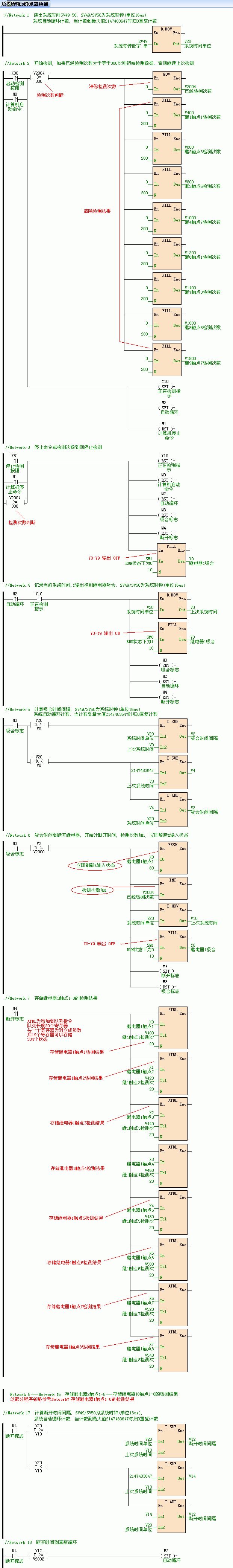 一、繼電器檢測設(shè)備控制要求 1、需要同時(shí)檢測10個(gè)繼電器 2、每個(gè)繼電器需要測試8個(gè)觸點(diǎn),共80個(gè)觸點(diǎn) 3、每次檢測需要300個(gè)周期,控制輸出12ms ON / 88ms OFF的脈沖為一個(gè)周期 4、需要將檢測結(jié)果保存在PLC中,要求停電保持,共需要保存80個(gè)觸點(diǎn)x300個(gè)周期合計(jì)24000個(gè)狀態(tài),如果將結(jié)果保存在寄存器中則最少需要1520個(gè)停電保持寄存器 5、每次檢測結(jié)束,上位機(jī)將結(jié)果讀出,根據(jù)繼電器8個(gè)觸點(diǎn)的吸合情況判斷該繼電器是否合格 二、該設(shè)備對控制系統(tǒng)的要求及海為相應(yīng)的特點(diǎn) 1、運(yùn)行速度快:要求程序掃描周期在1.5ms內(nèi),海為PLC由于運(yùn)行速度快,指令集豐富,程序非常精簡,實(shí)際運(yùn)行掃描周期為1~1.1ms 2、要有大范圍的數(shù)據(jù)停電保持區(qū):海為PLC的停電保持區(qū)可以任意設(shè)定,允許將所有數(shù)據(jù)區(qū)都設(shè)為停電保持,數(shù)據(jù)程序無須后備電池保護(hù),永不丟失。不需要用任何指令就可以實(shí)現(xiàn)該功能 3、具有ms級(jí)控制能力:海為PLC提供一個(gè)獨(dú)有的16us精度系統(tǒng)時(shí)間,SV49-SV50為系統(tǒng)時(shí)間(單位16us), 系統(tǒng)自動(dòng)循環(huán)計(jì)數(shù), 當(dāng)計(jì)數(shù)到最大值2147483647時(shí)歸0不斷循環(huán)計(jì)數(shù)。利用該系統(tǒng)時(shí)間可以方便實(shí)現(xiàn)ms級(jí)控制,誤差僅一個(gè)掃描周期 三、初始化脈沖數(shù)據(jù) 由于要控制輸出12ms ON / 88ms OFF的脈沖,轉(zhuǎn)換為16us時(shí)間單位如下: 12ms = 12000us = 750(16us),存放放在V2000-V2001中 88ms = 88000us = 5500(16us),存放放在V2002-V2003中 建立一個(gè)名稱為“時(shí)間間隔初始值”的初始寄存器值表,將ON時(shí)間設(shè)定為750和OFF時(shí)間設(shè)定為5500(當(dāng)然也可以不建立該表而選擇在程序中初始化V2000-V2001及 V2002-V2003的值),如下圖: 四、實(shí)現(xiàn)程序如下: 本程序掃描周期1ms,1如下圖: |