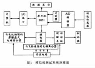 模擬機測試系統(tǒng)如圖3所示。由計算機發(fā)出信號開始,通過I/O接口,向單片機發(fā)出指令,使單片機發(fā)出指令通過繼電器,使離合器與電機斷開,然后單片機發(fā)出3路信號:一是通過計時器記錄時間;二是將轉速傳感器測得的轉速信號,通過A/D轉換,變成數(shù)字信號送到單片機內(nèi);三是單片機發(fā)出指令通過繼電器,控制二位三通電磁閥動作,將其制動。與飛輪聯(lián)接的電磁離合器還與另一個繼電器聯(lián)在一起,以便單片機發(fā)出指令控制飛輪實現(xiàn)不同慣量的模擬情況。開關電路作用是提供與電機連接的摩擦盤式電磁離合器、與飛輪連接的電磁離合器、制動驅動系統(tǒng)中的二位三通電磁閥的電源,采用+24V供電。