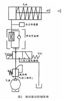 工作原理為:通過調節(jié)減壓閥的壓力值及流量閥流量獲得需要的制動力的大小和速度,壓力傳感器顯示制動狀態(tài)下的壓力大小,然后保持這一制動效果。雙向電磁換向閥在制動過程中,先將YA0接通,氣缸動作將被測制動器制動,到a1位開始制動,然后直到被測小型制動器停止轉動為止。后將YA0斷開,制動缸在彈簧力下回位,使制動缸恢復原位,制動過程結束。優(yōu)點是:結構簡單,成本低,使用維修方便。