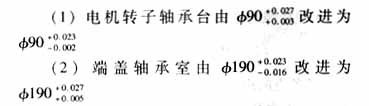 經(jīng)現(xiàn)場(chǎng)測(cè)試表明,適當(dāng)加大電機(jī)氣隙,除了可降低電磁噪聲外,更重要的是它還能消化裝配誤差造成的對(duì)電機(jī)的諸多影響,可穩(wěn)定電機(jī)噪聲的質(zhì)量水平。但是,加大氣隙也會(huì)對(duì)電機(jī)的電氣性能造成一定影響,所以在增大氣隙時(shí),一般不要超過(guò)原氣隙的40%。 4.1.2.2嚴(yán)格的檢驗(yàn)和改進(jìn)裝配工藝 (1)每臺(tái)電機(jī)在裝配前,轉(zhuǎn)子都要經(jīng)過(guò)嚴(yán)格的靜平衡校驗(yàn)和同軸度校驗(yàn)。 (2)對(duì)定子止口要增加對(duì)圓柱度的檢驗(yàn),對(duì)定子鐵心也要仔細(xì)檢查是否變形,鐵心內(nèi)徑是否變形,如有變形要保質(zhì)保量地修復(fù),以保證鐵心的質(zhì)量。 (3) 加工零配件時(shí),建立嚴(yán)格的質(zhì)檢制度,檢驗(yàn)環(huán)節(jié)要嚴(yán)格把關(guān),以確保加工質(zhì)量和精度。 4.2機(jī)械噪聲 經(jīng)研究分析,機(jī)械噪聲主要還是以軸承噪聲為主,而軸承噪聲又分為固有噪聲和裝配噪聲,我們通過(guò)觀(guān)察分析發(fā)現(xiàn)我們過(guò)去設(shè)計(jì)的軸承內(nèi)圈與軸、外圈與軸承室的配合偏緊,造成軸承工作游隙太小,加速了軸承的磨損,也造成軸承噪聲增大。因此,合理地選擇軸承的配合公差可以降低軸承的噪聲。具體措施為: