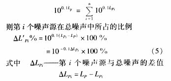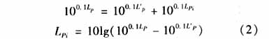 式中Lp——合成聲壓級(jí),dB Pi——第i個(gè)聲源的聲壓,N/m2 P0——基準(zhǔn)聲壓,P0=2×10-5N/m2 2.2聲壓級(jí)的相減 除了第i個(gè)噪聲源以外的其他幾個(gè)噪聲源合成的總聲壓級(jí)可以測(cè)定,用 表示,則將式(1)改為指數(shù)形式后可得