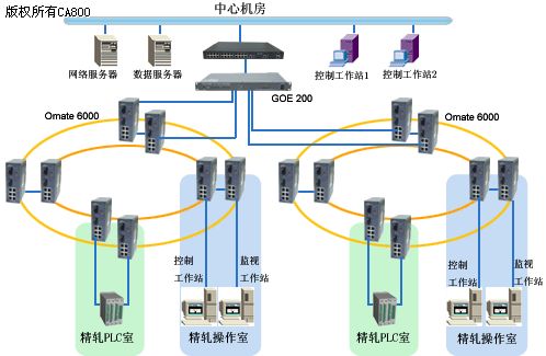 每個(gè)控制網(wǎng)絡(luò)包含熱爐板坯區(qū)、熱風(fēng)爐、水處理、精軋粗軋卷取PLC、操作室等不同系統(tǒng)。每個(gè)節(jié)點(diǎn)配置1臺(tái)Omate6000交換機(jī),分別組成多個(gè)子系統(tǒng)。各個(gè)子系統(tǒng)之間通過(guò)光纖/網(wǎng)線連接到相鄰子系統(tǒng),實(shí)現(xiàn)同一通訊鏈路層之間的冗余。