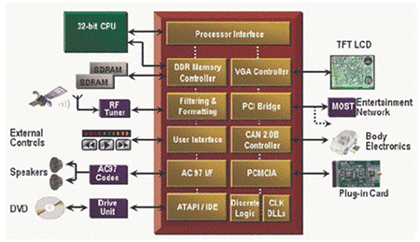 不用使用分立器件,僅把IP內(nèi)核用于更復(fù)雜設(shè)計(jì)的一部分就可以給CAN或LIN總線提供接口。減少元件數(shù)量可以帶來(lái)諸如降低整個(gè)系統(tǒng)的成本、降低庫(kù)存、提高系統(tǒng)可靠性和減少PCB復(fù)雜性和層數(shù)等多方面的好處。如圖2顯示顯示了一個(gè)通用的車內(nèi)多媒體設(shè)計(jì)框圖,該設(shè)計(jì)使用了CAN內(nèi)核、PCMCIA接口、PCL橋接、IDE接口和其他功能,在設(shè)計(jì)階段這些功能可以修改、變化,也可以根據(jù)終端用戶的要求進(jìn)行修改,通過(guò)對(duì)系統(tǒng)中的FPGA進(jìn)行重配置,這個(gè)模式還可以擴(kuò)展到現(xiàn)場(chǎng)修改或升級(jí)系統(tǒng)。