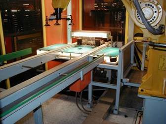 相機(jī)提供給使用RJ-2控制器的Fanuc 6軸機(jī)器人所有信息中的至關(guān)重要的兩個(gè)信息段。首先,一個(gè)來自相機(jī)的數(shù)字信號(hào)被發(fā)送至機(jī)器人,以確定玻璃變體;然后,相機(jī)將玻璃的坐標(biāo)系以串行形式發(fā)送給機(jī)器人,以便機(jī)器人能在每一個(gè)周期均能在同一個(gè)位置撿起玻璃。玻璃的坐標(biāo)系包含玻璃在視覺系統(tǒng)中的x軸、y軸和其旋轉(zhuǎn)角度。(前到后、邊到邊及旋轉(zhuǎn))。