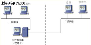 由于此公司各個分廠生產(chǎn)自動化系統(tǒng)比較復雜,IP地址設(shè)置也各有不同,按正常思路我們應(yīng)該把各分廠設(shè)備的IP地址統(tǒng)一在一個網(wǎng)段里,但這樣在配置時會暫時影響生產(chǎn)設(shè)備的運行,所以需要組建二級網(wǎng)絡(luò),各分廠原有的網(wǎng)絡(luò)結(jié)構(gòu)不變,在各分廠調(diào)度室或者控制室都增加一臺采用雙網(wǎng)卡的文件服務(wù)器,用其中一個網(wǎng)卡與一級網(wǎng)絡(luò)相連,另一網(wǎng)卡用于連接二級網(wǎng)絡(luò),如下圖所示: