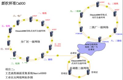 主廠區(qū)采用10臺Omate6000以太網(wǎng)交換機組成光纖自愈環(huán)網(wǎng),與10個點的原有的以太網(wǎng)交換機通過百兆電口相連,組成主廠區(qū)一級網(wǎng)絡(luò)。二鐵廠采用6臺Omate6000以太網(wǎng)交換機組成光纖自愈環(huán)網(wǎng),與6個點的原有的以太網(wǎng)交換機通過百兆電口相連,組成二鐵廠一級網(wǎng)絡(luò)??傉{(diào)室大樓采用3臺Omate6000以太網(wǎng)交換機組成光纖自愈環(huán)網(wǎng),與3個點的原有的以太網(wǎng)交換機通過百兆電口相連,組成總調(diào)室大樓二級網(wǎng)絡(luò)。主廠區(qū)一級網(wǎng)絡(luò)與總調(diào)室二級網(wǎng)絡(luò)組成相切環(huán),也就是在環(huán)與環(huán)直接通過光纜連接。二鐵廠一級網(wǎng)絡(luò)通過54M的無線網(wǎng)絡(luò)與總調(diào)室大樓二級網(wǎng)絡(luò)相連。