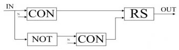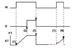 ![]() CON—計數器 NOT—非門 RS—復位優(yōu)先觸發(fā)器 IN—輸入 OUT—輸出 N—脈沖采樣個數 注釋:當外部有信號輸入時,控制系統(tǒng)采集連續(xù)的N個脈沖使RS觸發(fā)器輸出為“1”,只有當外部輸入信號由“1”變成“0”時,RS觸發(fā)器的復位端為“1”,將RS觸發(fā)器的輸出復位成“0”。而當有瞬間干擾脈沖時,CON計數器將采集不到連續(xù)的N個脈沖,CON計數器無法輸出,這就起到了減少干擾的作用。(N一般情況下取2) 優(yōu)點:響應速度快,對周期性的瞬時干擾起到了一定的抑制作用。 2、延遲輸入法 ![]() IN—輸入 OUT—輸出 TIME(ET)—延時時間 TON—延時輸出(其曲線如下圖)