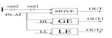 ![]() 注釋:當輸入IN=1時,啟動計數器直到計時時間(PT)=延時時間,OUT=1。當計數器計時時間〈延時時間,OUT=0。延時時間最好取1S以內。 優(yōu)點:消除了短時的周期干擾。 缺點:響應速度慢,不利于信號的快速傳輸。 二、減少模擬量輸入擾動的方法 1、限幅法