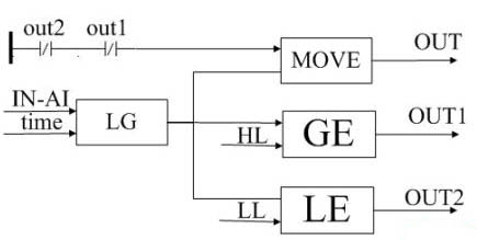 ![]() MOVE—移動保持指令(使能端EN=1,OUT=IN。EN=0,OUT保持前次值) GE—大于等于指令(OUT=1,IF IN1≥IN2) LE—小于等于指令(OUT=1,IF IN1≤IN2) HL—上限設定值 LL—下限設定值 LG—延遲濾波指令(其曲線如下圖) TIME—延遲濾波時間