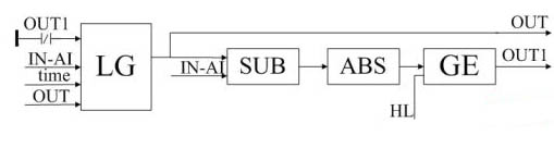 ![]() LG—延遲濾波器 SUB—減法指令 ABS—絕對值指令 GE—大于等于指令 HL—最大偏差值 TIME—延遲濾波時間 注釋:正常情況輸入信號IN-AI經過一階延遲濾波后直接輸出,OUT=IN-AI的值;當有突變信號時,輸入信號IN-AI經過一階延遲濾波后與含有突變信號的輸入信號IN-AI相減取絕對值(無論出現正偏差還是負偏差),與HL值比較,若大于等于HL的預設值,OUT1=1,將LG—延遲濾波器切換成跟蹤狀態(tài),此時OUT就保持了輸入信號IN-AI突變前的值。直到突變信號減弱,OUT1=0,OUT=IN-AI。 4、積分消抖濾波法