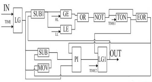 ![]() LG—延遲濾波器 SUB—減法指令 GE—大于等于指令 LE—小于等于指令 OR—或門(自做的DFB功能塊) NOT—非門 TON—延時輸出 EOR—異或門 MOV—移動保持指令 PI—比例積分調節(jié)器 HL—最大正向偏差值 LL—最大負向偏差值 TIME—延遲濾波時間 TIME1—延遲輸出時間 TIME2—延遲濾波時間 注釋:參數設置:LG(TIME=1S),TON(TIME1=10S),LG1(TIME=30S),HL=0.2,LL=-0.2 ,PI(TI=10S,將P放開封鎖成為純積分調節(jié)器) 三、 小信號在變化幅度中變化時 1、最終狀態(tài):此時為穩(wěn)態(tài),輸入與輸出相近。OR輸出為“0”,NOT=1,TON時間已超出10S,EOR=0,MOV不保持,PI不積分,SUB=0,信號走PI的跟蹤回路,LG1濾波后輸出。正常的信號流向:IN→LG→PI的跟蹤→LG1(濾波30S)→輸出 2、 小信號的暫態(tài)變化:(在TON=10S之前)OR=0,NOT=1,TON未到10S,EOR=1,MOV保持,PI積分作用,LG1未起作用,輸出跨越LG1(TIME=30S),直接到輸出端,此時為線性跟蹤濾波狀態(tài)。 四、 信號大幅度變化時(≥HL,≤LL) OR=1,NOT=0,TON不起作用,EOR=0,所以LG1(TIME=30S)不起作用,PI不起作用走跟蹤。正常的信號流向:IN→LG→PI的跟蹤→LG1的跟蹤→輸出 五、 總結: 1、 小信號在10秒之內,經過LG(TIME=1S),PI的積分作用,跳過LG1(TIME=30S),直接輸出,實現輸入信號的濾波和跟蹤狀態(tài)。 結束語 上述所分析的方法,均在生產實際中得到檢驗,取得了一定的效果,并隨著生產實際的需要和經驗的積累,不斷完善其對干擾的軟件處理方法。 |