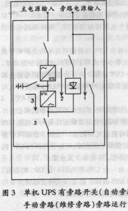 3)有旁路轉(zhuǎn)換UPS,負(fù)荷可由市電和逆變器供電,提高供電可靠性。多數(shù)UPS設(shè)置旁路。