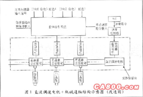 (2) 傳動裝置一般采用直流調(diào)速電機,有些六七十年代的設(shè)備采用的還是滑差調(diào)速電機。主傳動通過一臺直流調(diào)速主機(或一臺交流調(diào)速主機)驅(qū)動一根機械軸,再通過這根機械軸把各色組單元以及模切單元連在一起, 同步轉(zhuǎn)動。這種機械通軸結(jié)構(gòu)直至現(xiàn)在仍是卷筒紙凹印機普遍采用的傳動形式。